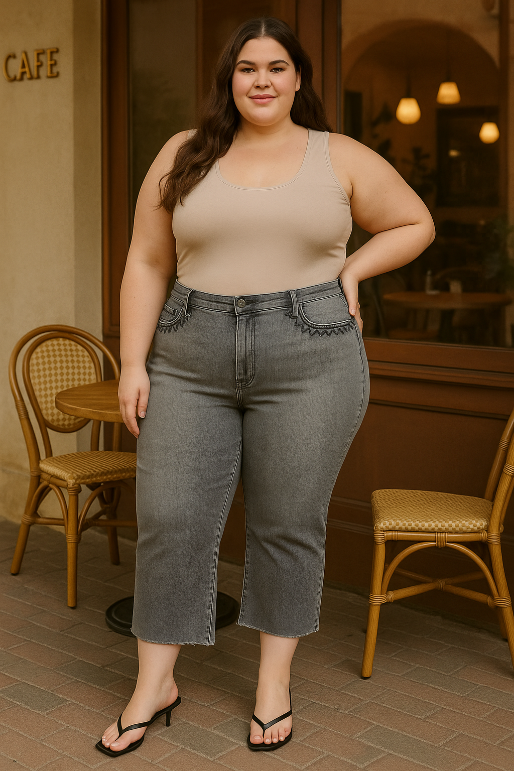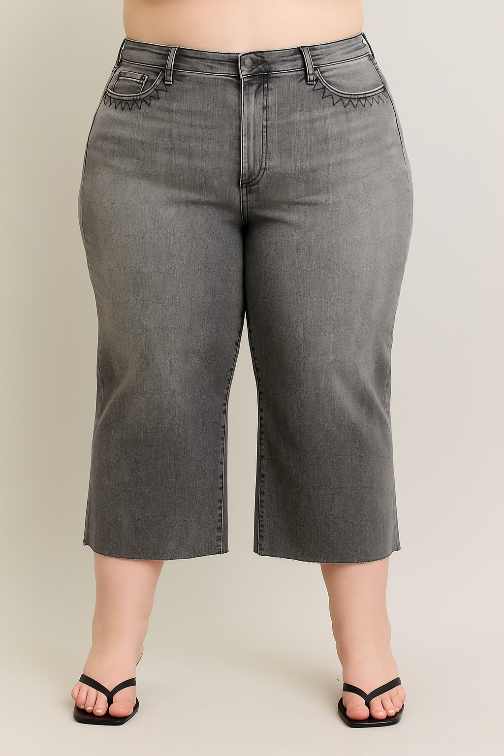 These stylish wide leg cropped jeans feature a flattering high-waisted silhouette with distinctive embroidered detailing on the pockets. Crafted from premium denim with a vintage-inspired wash, they offer a relaxed yet polished look. The cropped ankle length and wide leg design create a modern culotte-style aesthetic perfect for contemporary fashion enthusiasts. The comfortable fit and quality construction make them ideal for casual everyday wear while maintaining a sophisticated appearance. The embroidered accents add a unique artisanal touch that sets them apart from standard denim pieces.