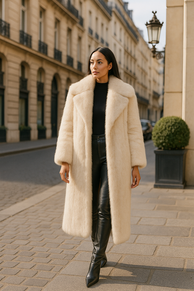 Cream Long Faux Fur Winter Coat – Luxury Plush Warm Full-Length Women’s Outerwear