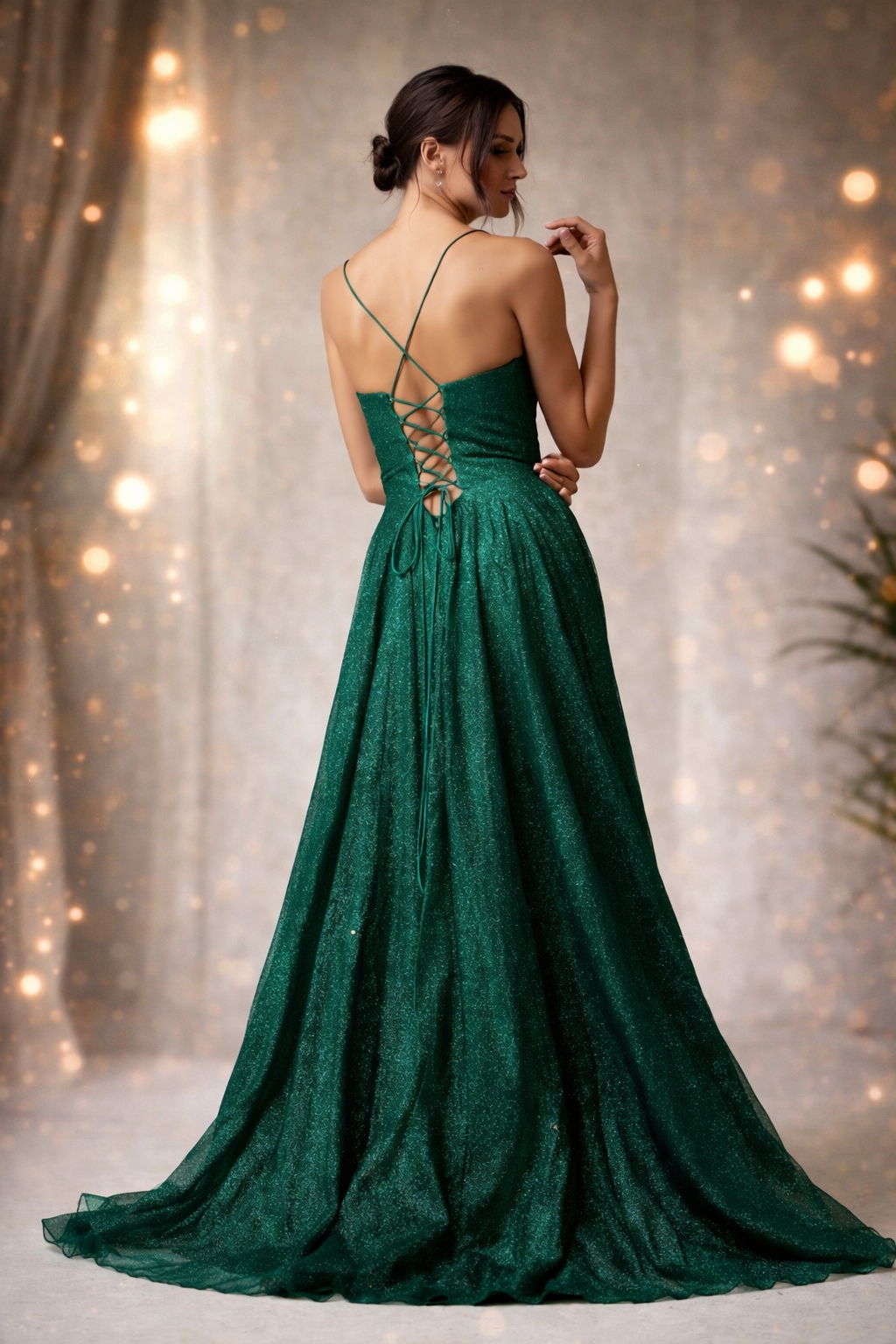 Emerald Green Glitter Lace-Up Back Evening Gown with Thigh-High Slit – Elegant Spaghetti Strap Formal Dress