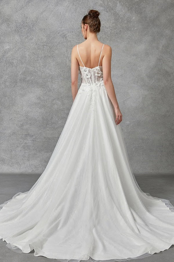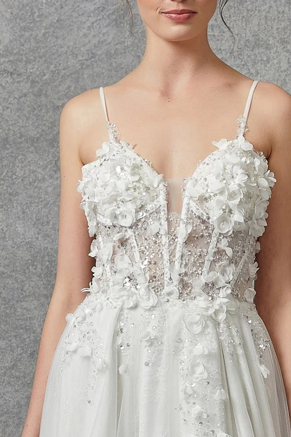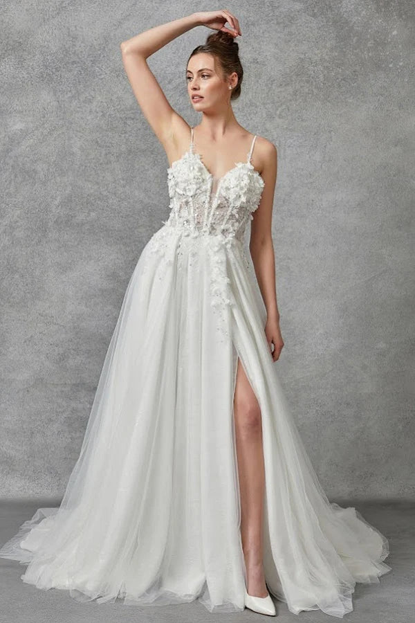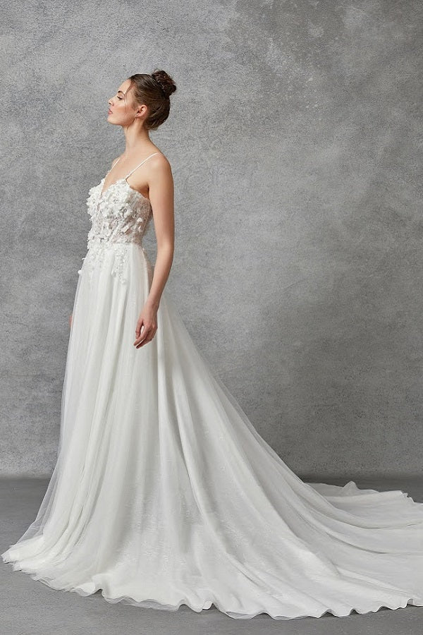 The gown flows into a graceful A-line silhouette crafted from soft tulle, creating effortless movement and a dreamy finish. Intricate lace appliqués, delicate 3D floral embellishments, shimmering beading, and subtle sequins adorn the bodice and skirt, adding dimension and a soft sparkle from every angle. A sweeping train completes the look, delivering unforgettable bridal drama as you walk down the aisle.