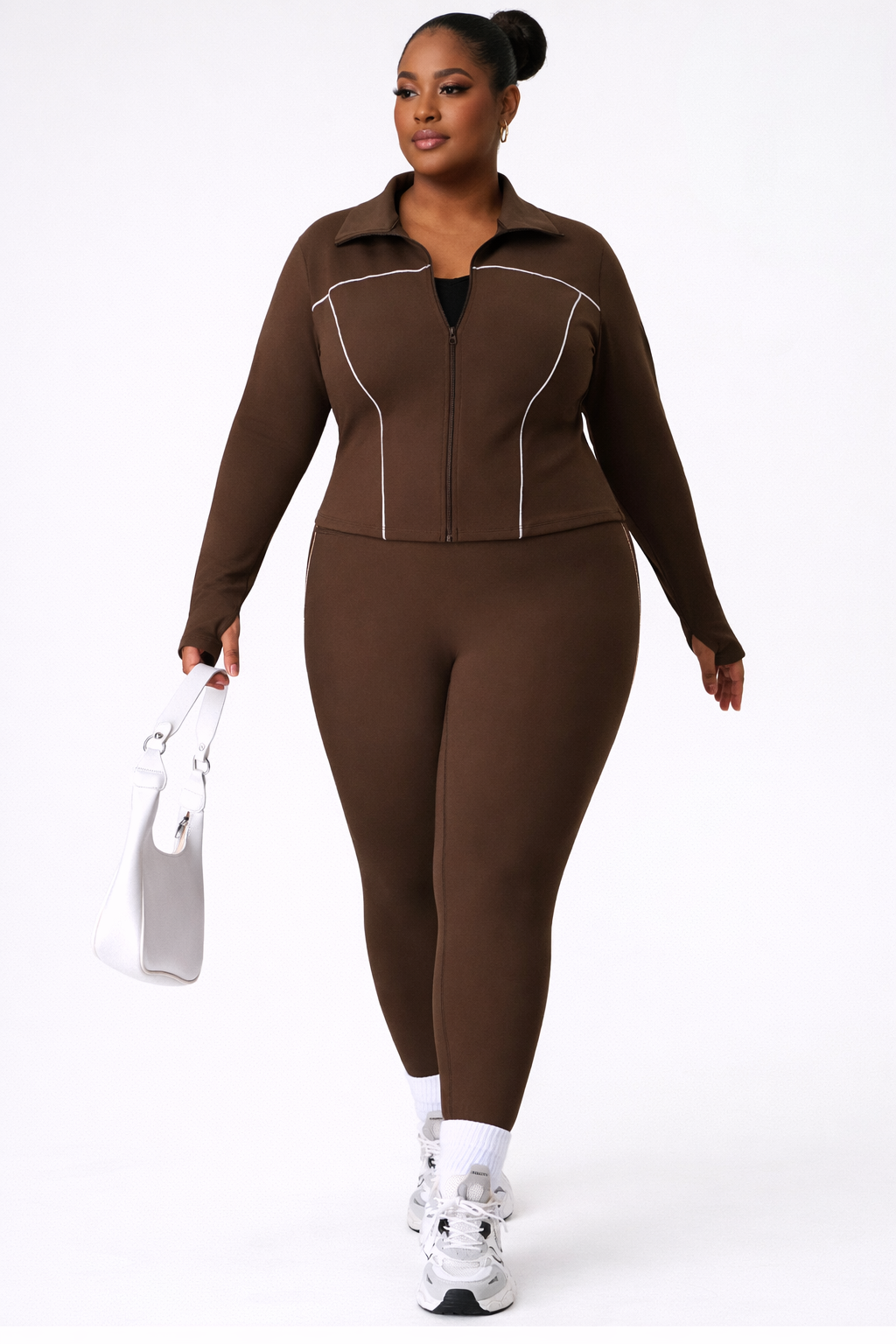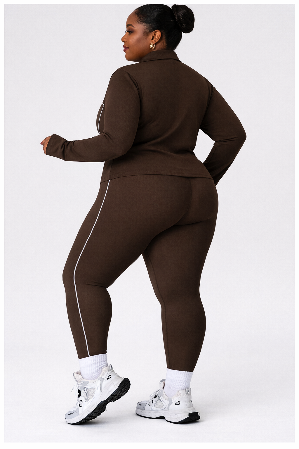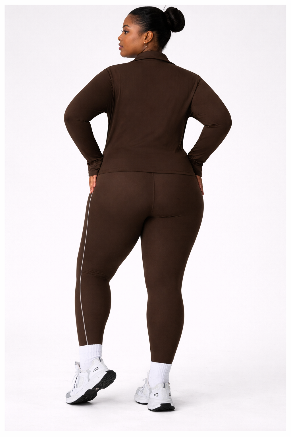 Crafted from premium moisture-wicking fabric, this set offers four-way stretch, breathable comfort, and squat-proof coverage—perfect for workouts, errands, travel, or athleisure styling. The rich chocolate brown color adds a luxury, on-trend look that flatters deeper skin tones beautifully.