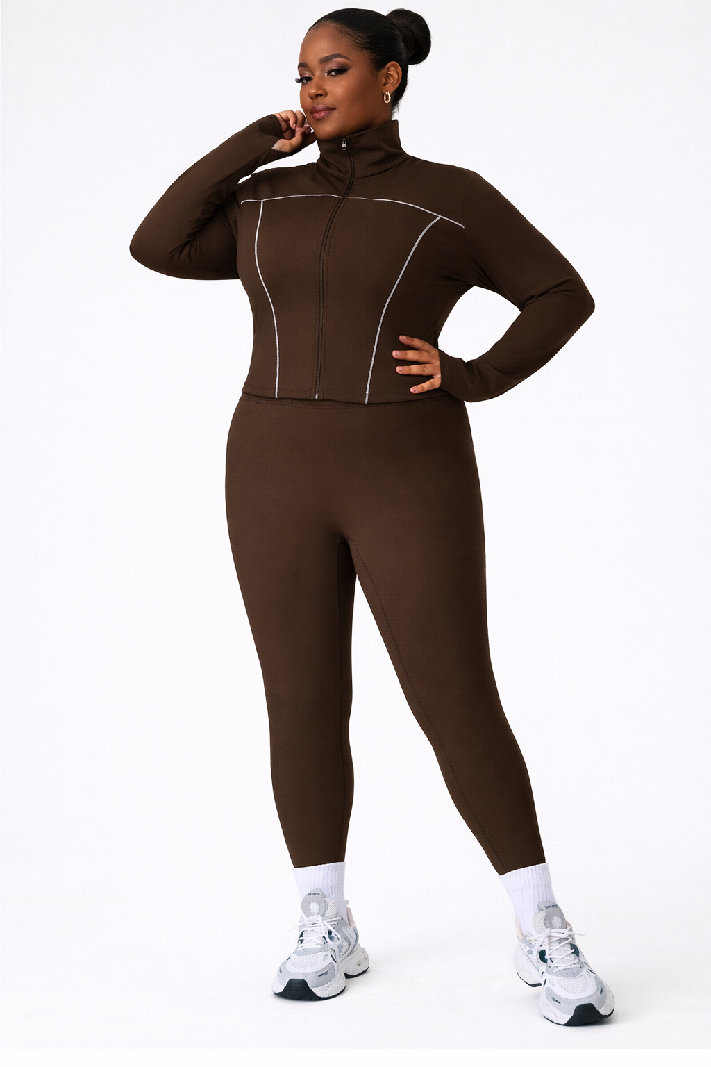 Turn heads while staying comfortable in our Plus Size Sculpting Activewear Set, designed to celebrate curves with a flawless, supportive fit. This two-piece set features a sleek zip-front performance jacket with contour seam detailing and high-waist stretch leggings that smooth, shape, and move with your body.
